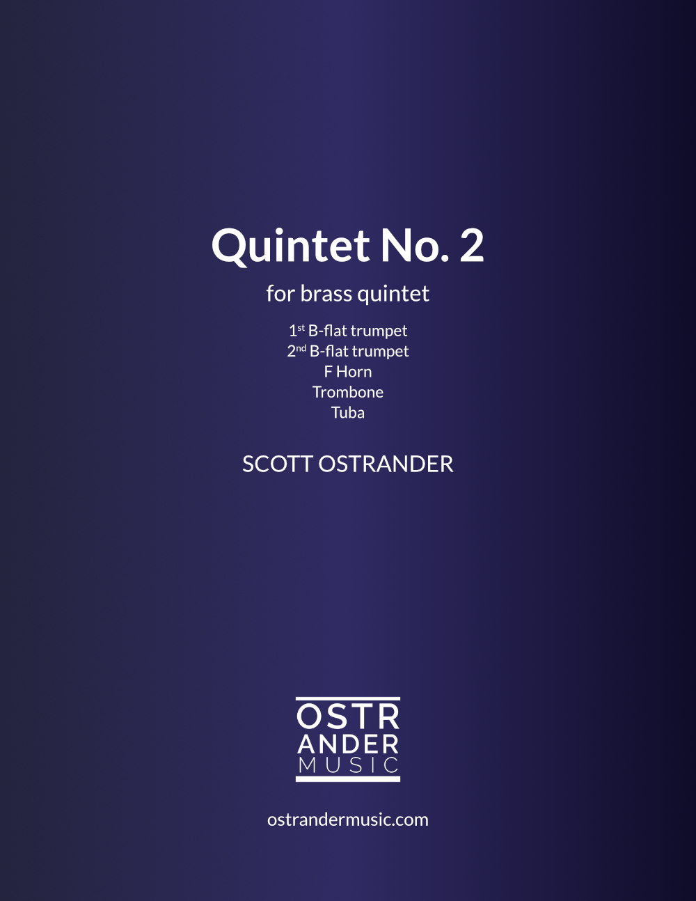 Quintet No. 2 for brass quintet is pensive and melancholy, yet ends with resolve. All five parts take the melody throughout. The slower tempo and independent phrases require good breath control from the performers. The piece begins in E-flat major and at measure 27 modulates to B-flat. The meter is 4/4 throughout except for a few 3/4 bars in the latter section. This work will contrast well with a fast and dramatic piece in a concert setting. For 2 B-flat trumpets, F horn, trombone, and tuba. Duration: Approx. 4 minutes See also Quintet for brass quintet by Scott Ostrander/Ostrander Music